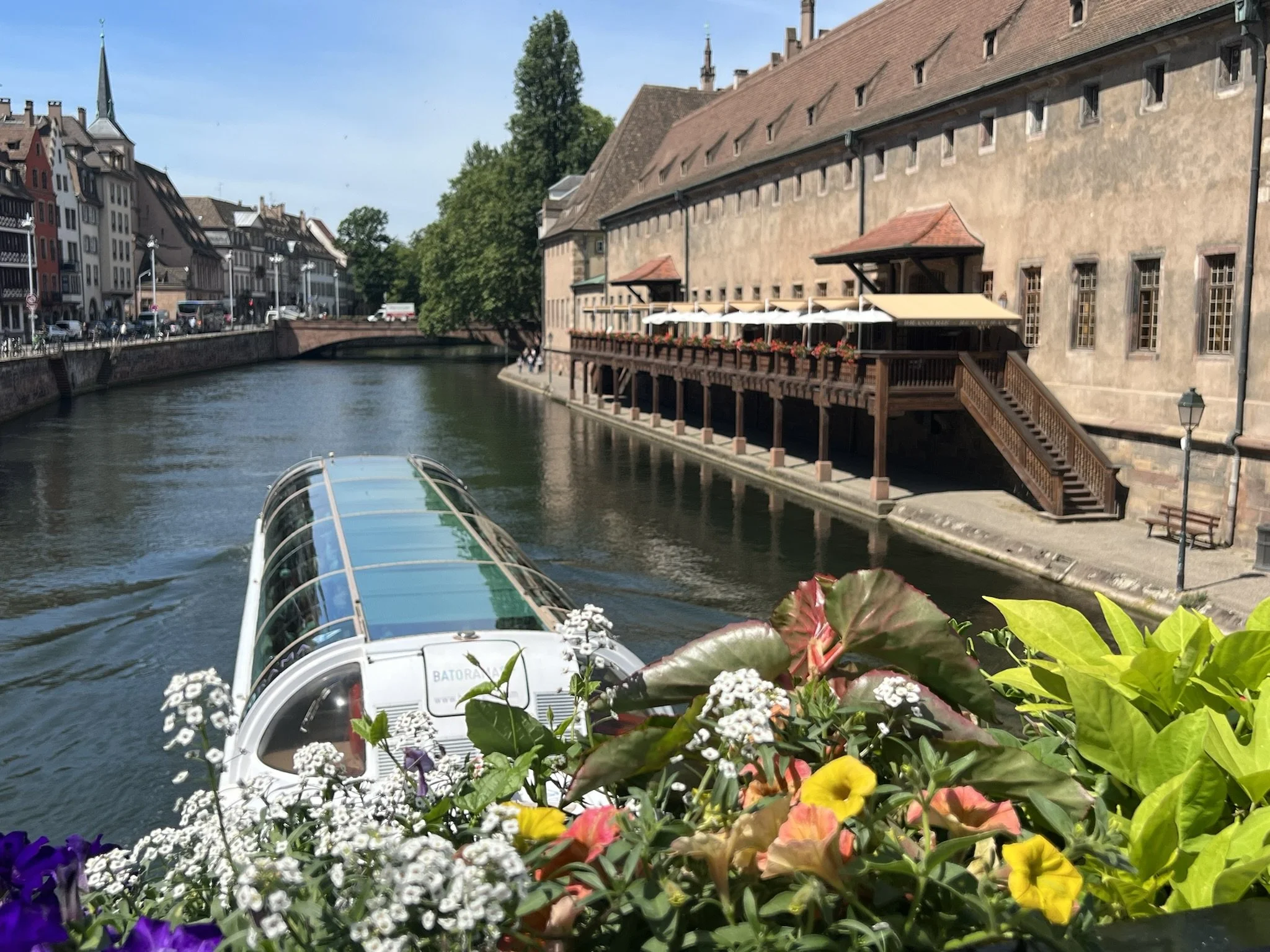 La majestueuse terrasse ombragée de l’Ancienne Douane situé côté du Pont Corbeau a été construite au bord de l’eau. En y étant installé vous aurez une vue imprenable sur l’Ill, de nombreuses maisons alsaciennes et les quais de Strasbourg. Bâtis sur pilotis, elle est accessible dès le printemps par les quais en empruntant les sublimes escaliers en bois massif, vous y accéderez aussi depuis l’intérieur de l’établissement par la rue de la Douane.